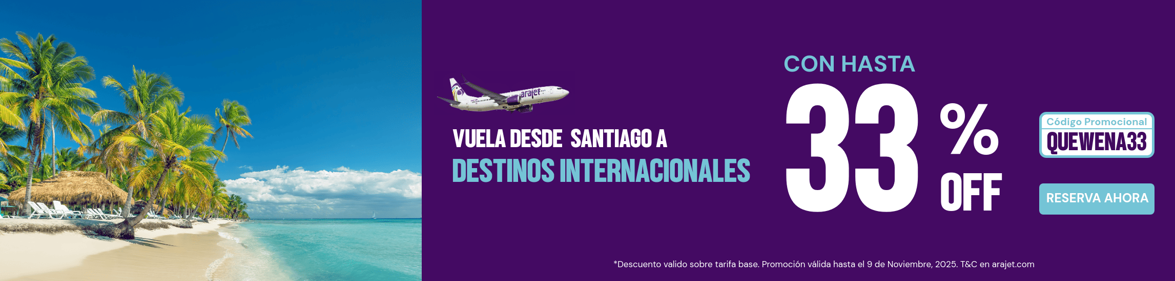 El pasajero podrá ahorrar hasta un 33% en la tarifa Basic, Classic, Comfort o en Extra utilizando el código promocional **“QUEWENA33”** sobre la tarifa base (tasas, cargos e impuestos no están incluidos) descuento varía por clase tarifaria. Esta oferta estará disponible para una cantidad limitada de asientos en vuelos seleccionados durante los meses del 15 de noviembre 2025 al 30 de junio 2026 (Sujeto a disponibilidad). Si la disponibilidad de vuelo o ruta elegida lo permite, Arajet podrá aumentar a su discreción el número de asientos disponibles a la Tarifa Promocional en cada vuelo a los Destinos Disponibles.